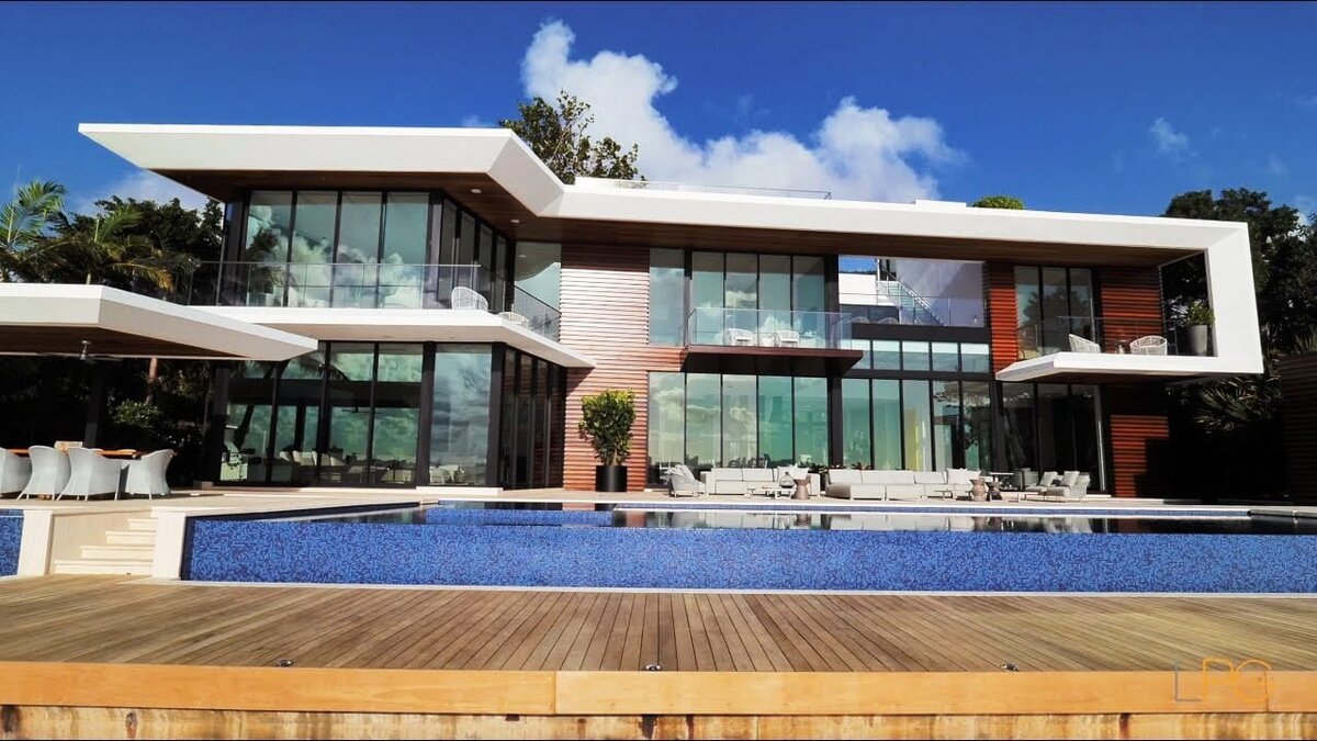 Современный архитектурный шедевр с ярким динамичным экстерьером находится в Южной Флориде. Дом вплотную подходит к набережной острова Ла-Горце в Майами-Бич, открывая потрясающий вид на залив и город вдалеке. Общая квадратура участка превышает 2 100 кв. м., при этом жилая площадь особняка составляет внушительные 1 000 кв. м. Набор помещений в особняке представлен 7 роскошными спальнями, 10 эксклюзивными ванными комнатами, огромной гостиной с панорамными окнами в два уровня, столовой и кухней. Помимо этого в доме имеется уютный домашний кинозал, стеклянная винная комната, рассчитанная для хранения более 200 бутылок вина, великолепно оборудованный тренажерный зал с отдельным входом с улицы, а также комнаты для проживания обслуживающего персонала. Первый уровень представляет собой единое пространство, в котором нет границ – функциональные зоны свободно перетекают одна в другую. Объемность помещений подчеркнута атриумом, оканчивающимся великолепным зенитным окном в крыше дома, а также элега