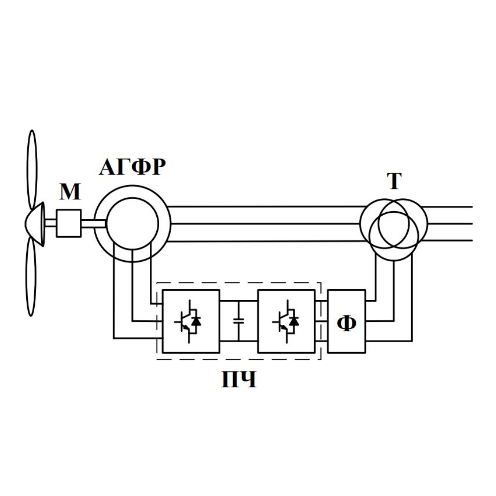 - ВЭУ с генератором двойного питания (Тип 3). Примером ВЭУ с переменной скоростью является АГДП. Это одна из основных конфигураций ВЭУ в современной ветроэнергетике. Статор подключается непосредственно к сети, а ротор подключается к сети с помощью преобразователя частоты (ПЧ) и трансформатора, рассчитанных не на полную мощность генератора [20, 21, 33÷39]. ПЧ позволяет управлять мощностью в цепи ротора. Выходная генерируемая ВЭУ мощность в этой конструкции представляет собой сумму мощностей статора и ротора. Когда машина работает при выше синхронных скоростях, мощность от ротора передается через преобразователь в сеть, когда машина работает при ниже синхронных скоростях, мощность ротором потребляется из сети через преобразователь. При синхронной скорости между ротором и сетью не происходит значительного обмена энергией. Поскольку как статор, так и ротор обменивается энергией с сетью, генератор называют машиной двойного питания (МДП). Диапазон скоростей ВЭУ на базе АГДП, как правила составляет около ±30% относительно синхронной скорости. Такой диапазон изменения скоростей обычно удовлетворяет всем условиям изменения скорости ветра и, следовательно, достаточен для работы ВЭУ с переменной скоростью. Мощность ПЧ соответствует произведению максимального скольжения s = ±0,3 на номинальную мощность статорных обмоток генератора [24, 39÷41]. Использование преобразователя не на полную мощность генератора приводит к снижению стоимости, веса и физического размера ВЭУ. По сравнению с системами с фиксированной скоростью значительно повышается эффективность преобразования энергии ВЭУ на базе АГДП. ПЧ нельзя непосредственно подключать к сети, т.к. это приведет к генерации искажений в ней и к необходимости использовать фильтр. Для решения проблем, вызванных высшими гармониками, в практических системах преобразования энергии ветра используются различные типы гармонических фильтров (Ф). На стороне генератора (т.е. на входе преобразователя) для уменьшения гармонических искажений напряжения и тока в нем часто используются L-фильтры. Это приводит к уменьшению потерь в магнитном сердечнике генератора и обмотке от гармонических составляющих. Фильтры LC также могут использоваться для достижения лучших результатов. Фильтр LCL часто используется в сетевых преобразователях для удовлетворения строгих гармонических требований, определенных различными параметрами сети. Фильтры LC также встречаются в практических ВЭУ, но они не так эффективны, как фильтры LCL.