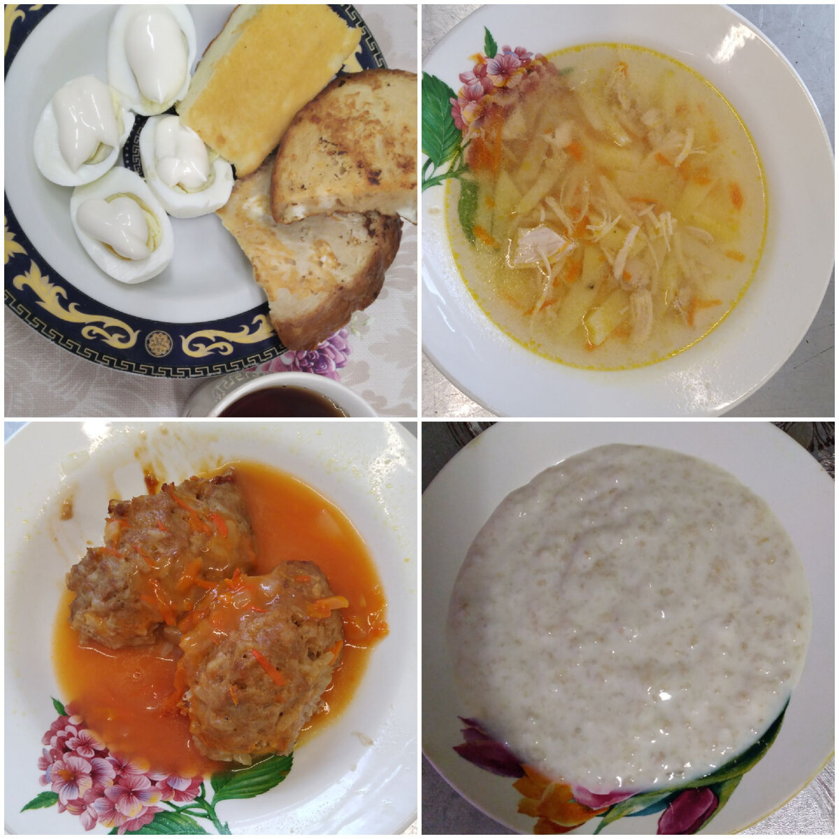 На завтрак было: два яйца с майонезом,два жареных куска хлеба и кусок пирога ( манник)На обед - куриный суп,два ленивых голубца. На ужин молочная геркулесовая каша.