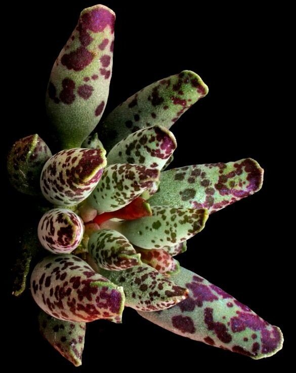 Миниатюрный суккулент с темно-зелеными листьями, покрытыми коричневатыми пятнами. Листовая пластина гладкая, с глянцевой поверхностью, имеет овальную форму и волнистый край. Длина листа составляет 5 см. Вдоль длинного, мясистого цветоноса расположены розоватые трубчатые цветки с пятью сросшимися лепестками. Размер одного цветка составляет 1,5 см.