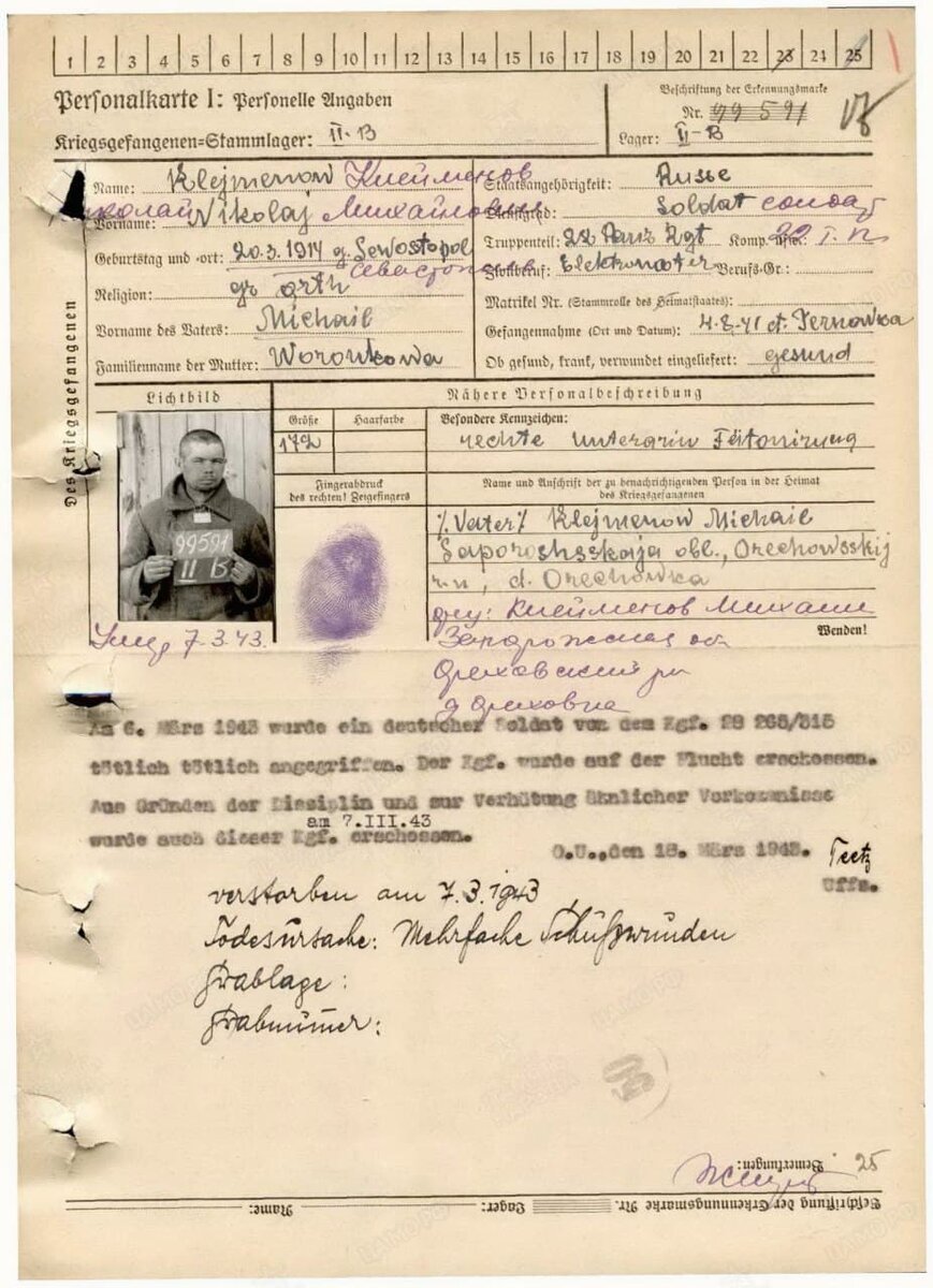 Вот так выглядят документы военнопленных. Крайне редко в них встречается фотография. Обычно фигурируют ФИО, дата и место рождение, звание, место пленения, место содержания. Дата кончины, если человек погиб в плену.