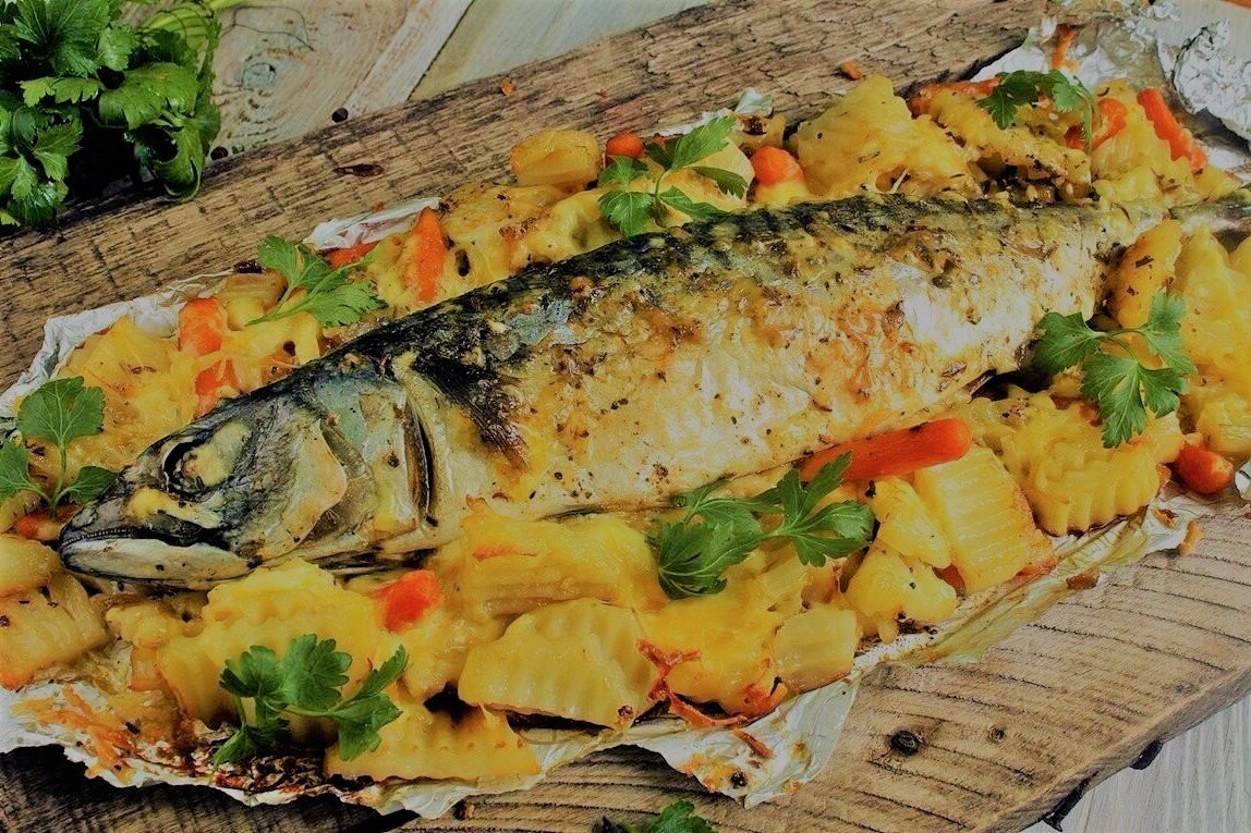 Ингредиенты: 2,5 кг рыбы, 1 лимон, 2 луковицы, 4 помидора, 4 картофелины, 4 ст. ложки растительного масла, 1 пучок зелени петрушки или сельдерея, соль, черный молотый перец. Способ приготовления: Рыбу вымыть, отрезать голову и хвост, отрезанное филе отварить, остудить и порезать небольшими кусочками. Лук, помидоры вымыть, очистить и мелко нарезать. Картофель вымыть, отварить в мундире, остять, очистить, нарезать кубиками. Зелень петрушки или укропа вымыть, нарубить. Рыбу, помидоры, лук и зелень смешать, положить в форму, посолить, поперчить, полить маслом и посыпать мелко нарезанным картофелем. Залить смесью и готовить в духовке при температуре 180 °C 30–40 мин. При подаче к столу посыпать блюдо зеленью. Рыба жареная с черносливом Основные ингредиенты: 1 кг рыбы. Для приготовления маринада: 4–5 ст. ложек растительного масла. 1 ст. ложка лимонного сока. 2–3 лавровых листа, 1 перец горошком, 1–2 гвоздики, 1 ч. ложка сахара, 1 ст. ложку соли. Способ и способ приготовления: Филе рыбы промы