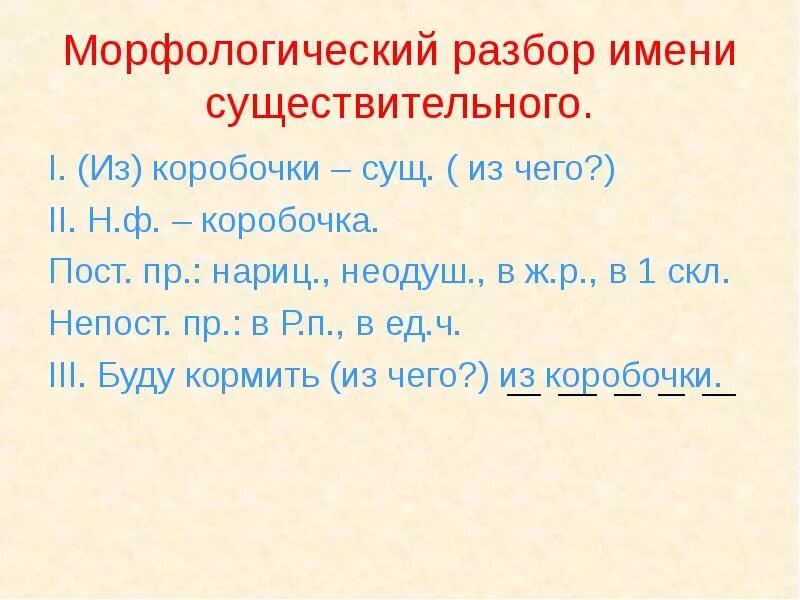 План разбора имени существительного Многие испытывают трудности с пониманием морфологического разбора имени существительного, порядком его выполнения или выделением морфологических признаков существительного. Данный онлайн сервис поможет вам разобрать введенное слово с примерами и планом разбора. Общий порядок морфологического разбора имени существительного: Порядок разбора в вашем классе может отличаться от предложенного, поэтому настоятельного советуем уточнить требования к морфологическому разбору у вашего учителя. Схема морфологического разбора существительного и образец разбора и образец разбора Схема морфологического разбора существительного и образец