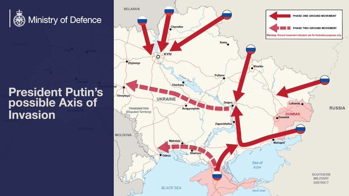 Մեծ Բրիտանիայի պաշտպանության նախարարությունը հինգշաբթի Twitter-ում տեղադրել է «Ռուսաստանի նախագահ Վլադիմիր Պուտինի ներխուժման հնարավոր առանցքը» քարտեզը՝ ենթադրելով, որ ՌԴ-ն ագրեսիվ մտադրություններ ունի Ուկրաինայի նկատմամբ, գրում է ТАСС-ը։ «Ռուսաստանը պահպանում է զգալի ռազմական ներկայություն, որը կարող է առանց նախազգուշացման ներխուժման հանգեցնել», – ասված է բրիտանական ռազմական գերատեսչության հաղորդագրության մեջ՝ վկայակոչելով նոր հետախուզական տվյալները: Դրանում նշվում է, որ Պուտինը «դեռ կարող է ընտրություն կատարել հակամարտության կանխարգելման և խաղաղության պահպանման օգտին»: