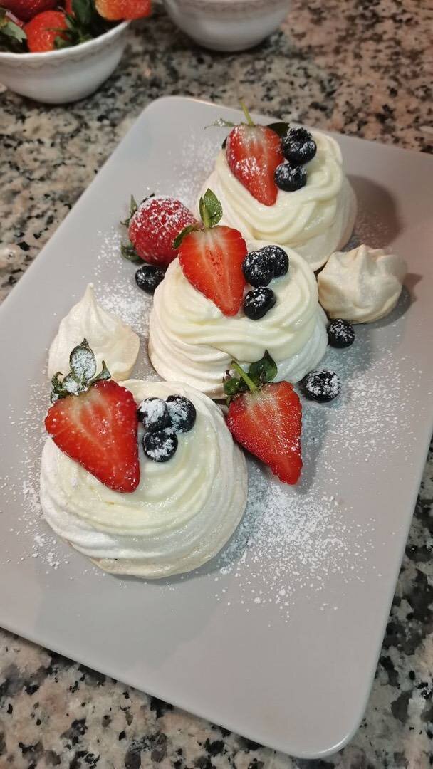 Ингредиенты: Основа: , Яичные белки , Сахар , Кукурузный крахмал , Крем:, Сыр маскарпоне , Сахарная пудра , Для украшения ягоды по своему вкусу ))