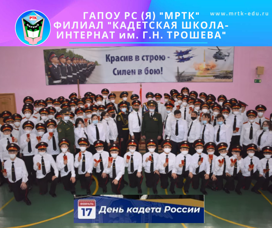 КШИ им. Г.Н. Трошева: «День Кадета России». 17 февраля отмечается День Кадета России. В «КШИ им. Г.Н. Трошева» повышенное внимание уделяется вопросам патриотического и нравственного воспитания кадет, организуется ранняя профориентация, реализуются дополнительные образовательные программы. Кадеты делятся яркими впечатлениями о своем обучении: для них это не только знания по общим и профильным предметам, но и ценный жизненный опыт, тренировка выдержки, дисциплины, силы воли и прочный фундамент для будущей профессии. Напомним, что история российского кадетского движения началась 290 лет назад. Указом императрицы Анны Иоановны был учрежден первый в стране Шляхетный (Дворянский) кадетский корпус в Санкт-Петербурге. Его учащиеся осваивали военные, естественные, точные и гуманитарные науки. В последующие годы количество кадетских корпусов стало увеличиваться и к началу XX века насчитывало три десятка. Многие великие деятели нашей страны были выпускниками кадетских учебных заведений. Среди них