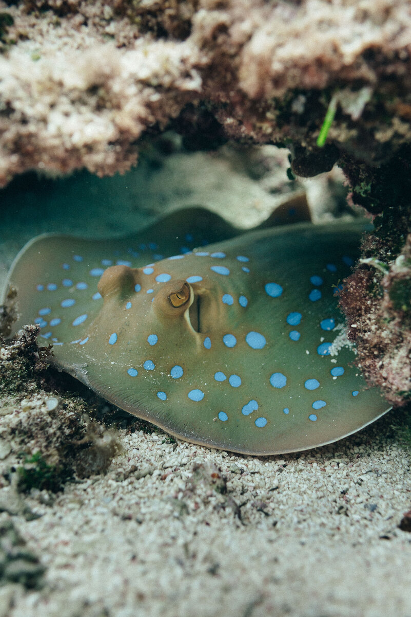 Синепятнистый скат-хвостокол любит лежать на дне рядом с берегом иногда зарываясь в песок! Скат относится к Хрящевым рыбам и сходство с акулой у него больше, чем с камбалой! Акулы и скаты, имеют практически одинаковое внутреннее строение: хрящевой скелет, плакоидная чешуя, отсутствие жаберных крышек, наличие 5-7 жаберных щелей, отсутствие плавательного пузыря. Скат вырастает до 4х метров в диаметре и питается мелкими людьми!