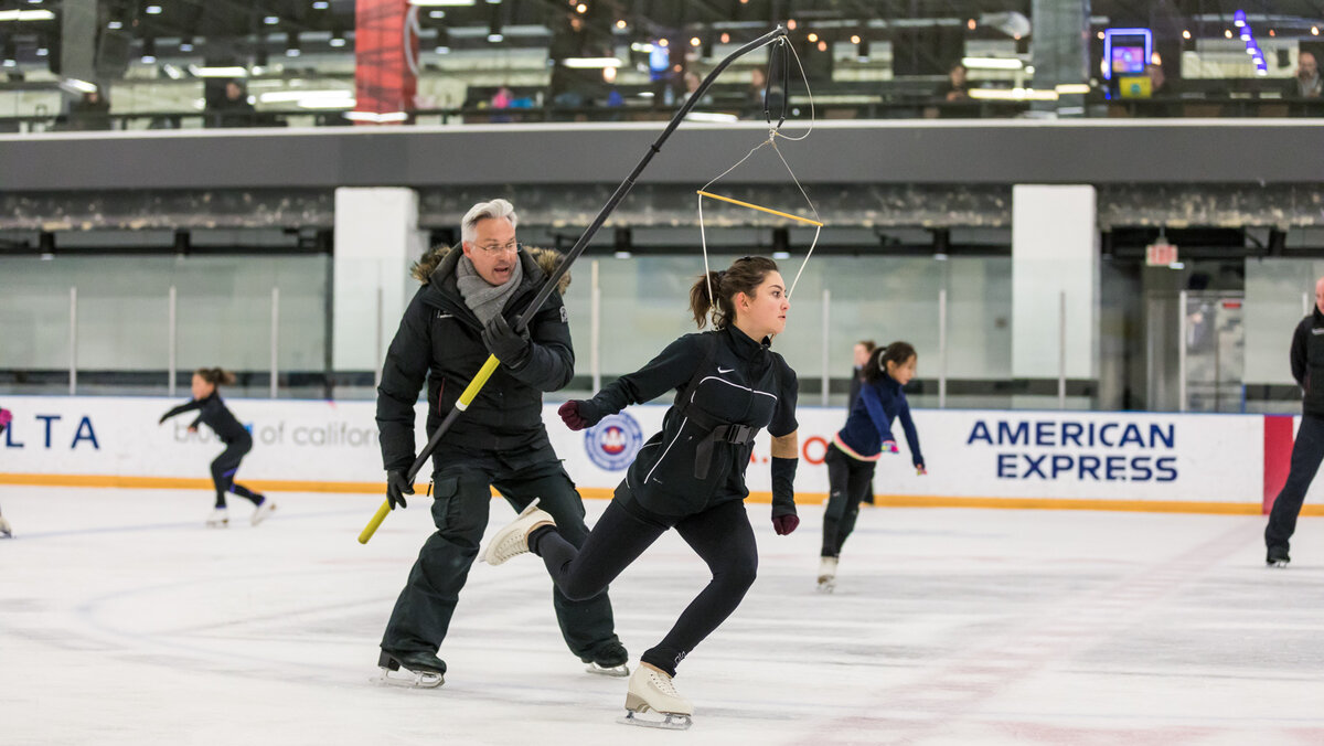 Цирковая страховка давно стала обычным тренажером в обучении сложных элементов у фигуристов. Эта страховка, которую называют «лонжа» («веревка» с француского), позволяет двигаться и вращаться, почти не сковывая движений. Такую поддержку в подготовке фигуристов начали использовать практически с самого появления этой дисциплины, задолго до того, как прыжки в несколько оборотов стали обычными и обязательными. Лонжа, переброшенная через крепление над катком, помогала ученику преодолеть страх перед прыжками и научиться держать равновесие в приземлении. Свободный конец удерживал тренер, который натяжением мог поддержать спортсмена в полете чуть дольше. Есть совсем детский вариант, без верхней страховки – когда тренер поддерживает руками лямки, и приподнимает ребенка в прыжке. Самый распространенный сейчас тип лонжи для фигуристов – так называемая «удочка», она позволяет передвигаться тандему ученик-тренер по всему катку и при этом дает обучающемуся достаточно пространства и имитацию самостоя