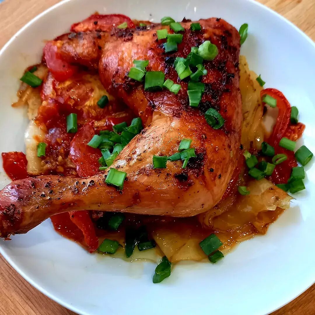 Ингредиенты: окорочка, капуста, помидоры, чеснок, соевый соус, сладкий чили соус, черный перец, растительное масло, зелень, специи Способ приготовления: 1. В небольшую миску: растительное масло, соевый соус, соус чили, тёртый чеснок, перец, зелень. 2. Этой смесью натираем окорочка и оставляем на 1 час мариноваться. 3. Нарезаем капусту большими кругляшами, примерно толщиной в 1 см. 4. Капусту раскладываем на противень или форму для запекания. Смазываем капусту маринадом. 5. Сверху на капусту выкладываем помидоры. 6. Далее на помидоры кладём замаринованные окорочка и посыпаем специями (кто какие любит). 7. Запекаем в духовке при t°180/60мин. Блюдо получается ароматным, сочным и очень вкусным!😋👍 Всем приятного аппетита!