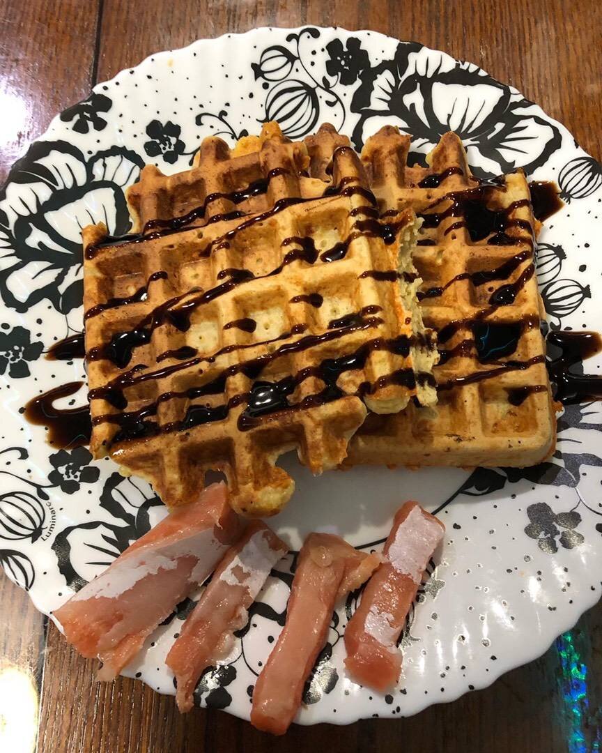 ПП мой образ жизни и поэтому я люблю питаться правильно , а так же люблю быстрые и вкусные рецепты . Которые занимают менее 20 минут в приготовлении #завтрак Ингредиенты: сыра, яйцо, овсяной муки, натурального йогурта Способ приготовления: Сыр натереть, смешать все ингредиенты и выпекать в вафельнице. Полить соусом без сахара, можно добавить с/с рыбку. Приятного аппетита.