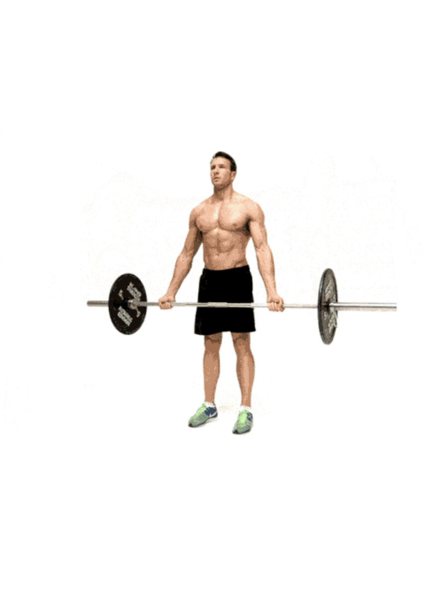 - Гриф держите на вытянутых руках, хватом снизу, чуть шире плеч.