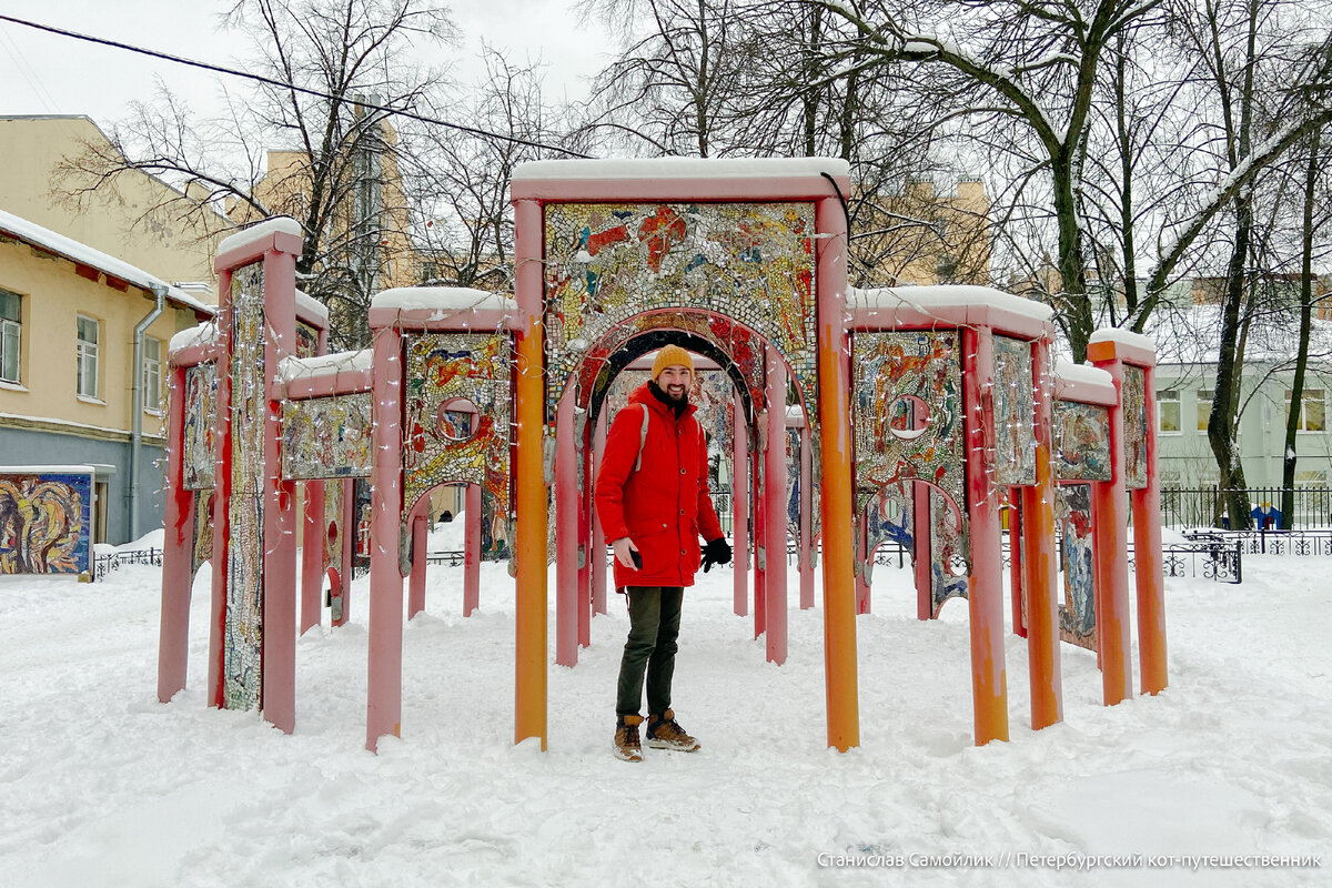 В самом центре города, неподалеку от Летнего сада, в обычном дворе находится уникальное место, музей под открытым небом - мозаичный дворик. Выдался случай на прогулке с друзьями заглянуть сюда и посмотреть, как дворик выглядит зимой, заодно и вам показать. Попасть сюда несложно, есть два основных входа. Один с набережной реки Фонтанки, но там ворота и возможно иногда они могут быть закрыты. Другой способ, вход с улицы Чайковского. Мозаикой здесь украшено практически все! Помимо фигур, которые расположены повсюду, даже фасады домов все украшены. Местные жители явно к этому привыкли и паркуют свои авто вплотную к мозаичным стенам. Официально все это называется интерактивным проектом музея под открытым небом "Санкт-Петербург - Олимп культуры" заслуженного художника России В. В. Лубенко. Началась работа над украшением обычного городского двора еще в далеком 1984 году. В течение десятилетий Владимир Лубенко вместе со своими учениками из Малой Академии искусств расписывал двор, превращая е