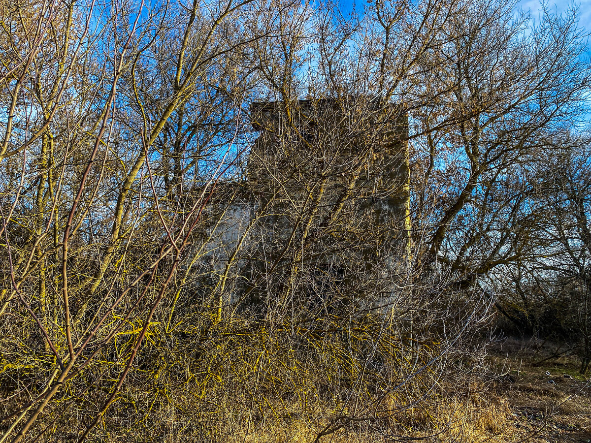 Продолжаем нашу прогулку по опустевшему поселку, который мы посетили в начале зимы, когда еще не было снега. Шли мы по его заросшей улицы, и вдруг увидели в густых зарослях контур какого-то строения. Однозначно, это был не жилой дом, уж больно высоким было то здание. Конечно же, мы не смогли пройти мимо, не осмотрев эту заброшку. Еле-еле пробрались к нему через заросли, при этом исцарапав практически все руки. Возле строения увидели лежащие на земле керамические изоляторы от электропроводки. Здесь неподалеку на речке находится заброшенная ГЭС, видимо, это здание тоже как-то с ней связано. Внутри здание оказалось довольно объемным и высоким. В нем сохранились какие-то бетонные перегородки. Предполагаю, что там находились трансформаторы, на которые подавался ток, полученный на гиэроэлектростанции. На этих бетонных перегородках, где по нашему предположению, стояли трансформаторы, были написаны названия населенных пунктов, куда потом электричество подавалось. Вот, например, на одной было