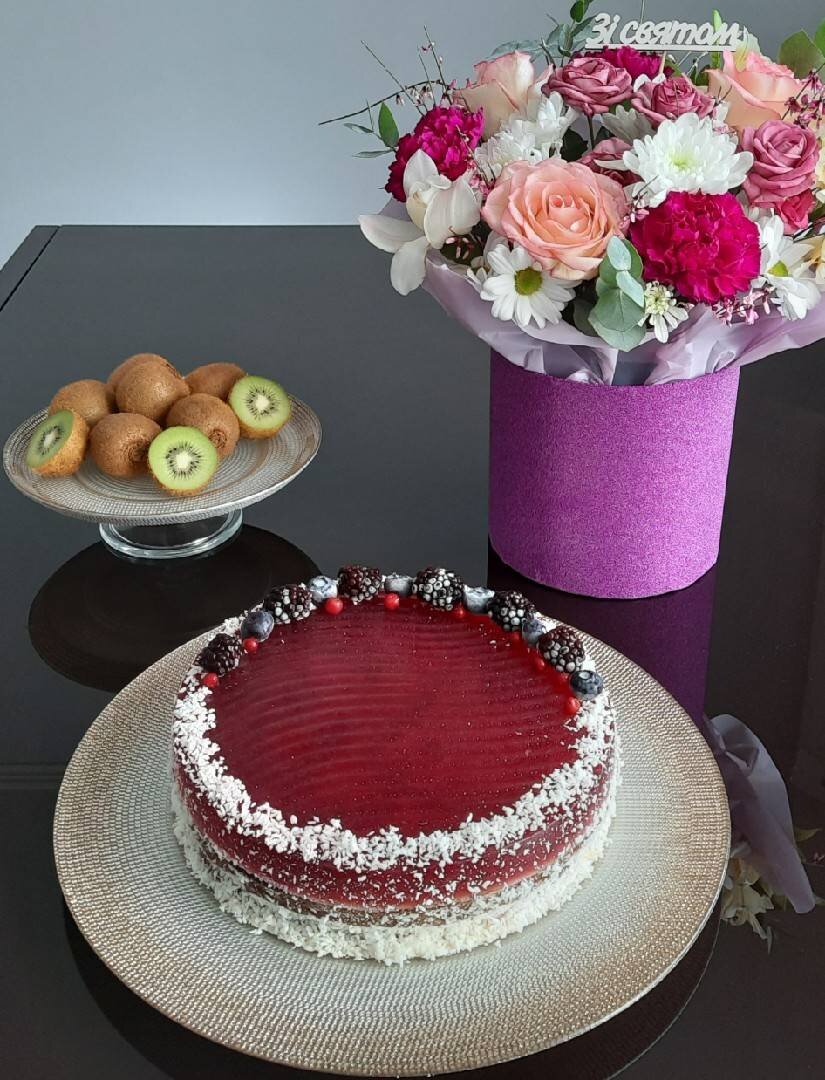 #ігри #меню Ингредиенты: Банановый бисквит, бананов, яиц, разрыхлителя, молока, муки (можно рисовой), какао, соли, ванилина, грецких орехов, Крем, крем-сыра, сливок 10%, сахарной пудры, Смородиновый мусс, смородины, Сахар , воды, желатина, Ягоды для украшения, кокосовой стружки Способ приготовления: Бананы измельчаем в блендере. Орехи чистим и тоже измельчаем. Яйца перетираем с солью и соединяем с бананами. Добавляем просеянную муку, разрыхлитель, какао и ванилин. Все перемешиваем и выливаем в смазанную сливочным маслом форму. Выпекаем до готовности при 180 градусах. Варим компот из смородины. Процеживаем. Добавляем сахар, желатин, хорошо перемешиваем, остуживаем, наливаем в две формы и отправляем в холодильник. Сливки взбиваем с сахарной пудрой. Добавляем сыр, перемешиваем. Бисквит разрезаем на 2 части. Собираем торт: бисквит-- крем -- суфле -- крем --бисквит-- крем -- суфле. Украшаем кокосовой стружкой и ягодами. Приятного аппетита!