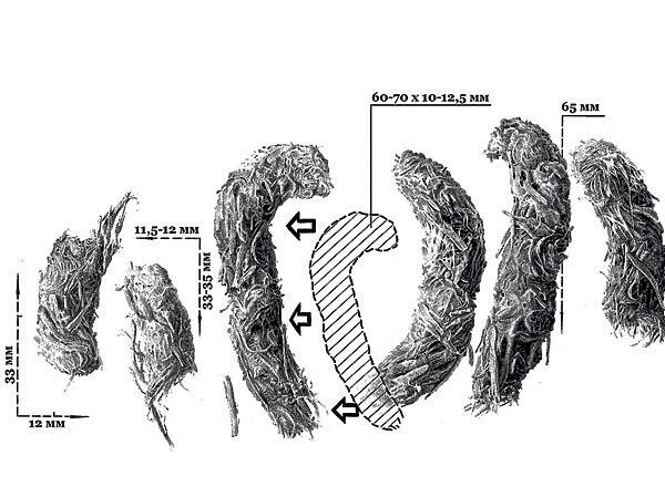 Классический зимний помет петуха глухаря из остатков исключительно сосновой хвои.