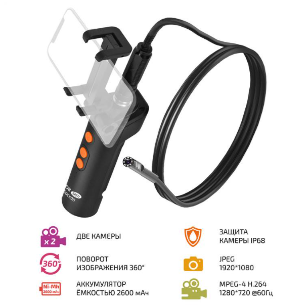 МЕГЕОН 33071 - видеоскоп- эндоскоп с подключением через Wi-Fi. Прибор удобен своей возможностью работать с большим количеством мобильных устройств. Теперь размер изображения зависит только от диагонали экрана личного смартфона или планшета. Программное обеспечение позволяет работать с операционными системами на базе Android и IOS. Необходимое приложение доступно скачивания без ограничения в Play Market и APP Store. Конструкция захвата позволяет свободно удерживать гаджет шириной до 73 мм, но это не мешает держать более габаритный аппарат в руках, так как передачу данный обеспечивает дистанционная связь. Видеонаблюдение осуществляется с двух пыле- влагозащищённых камер- фронтальной и боковой. Яркая светодиодная подсветка высокой интенсивности гарантирует прекрасную видимость в полном отсутствии освещения. Зонд жёсткого исполнения стыкуется к рукоятке при помощи разъёмного соединения. Особенности: Комплект поставки: 1. Эндоскоп МЕГЕОН 33071 - 1 шт. 2. Зонд 1 метр - 1 шт. 3. Насадка "Маг