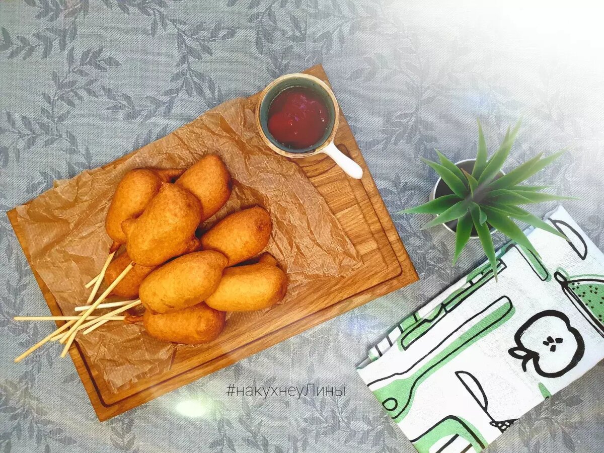 Идеальное блюдо для встречи с друзьями, быстро и легко готовить и вкусно съесть! Сегодня предлагаю классный рецепт "сосиски в тесте", обязательно стоит попробовать 🥰 #меню #корндоги Ингредиенты: кукурузной муки, пшеничной муки, молока, яйцо, сосисок, сахара, соли, разрыхлителя, соды, растительного масла Способ приготовления: Вылить молоко в миску, добавить яйцо и взбить блендером. Смешать сухие ингредиенты (мука кукурузная и пшеничная, соль, сахар, разрыхлитель и сода), перемешать венчиком. Соединить сухие и влажные ингредиенты, хорошо перемешать. Разрезать сосиски пополам, нанизать на шпажки. Налить тесто в стакан. Разогреть масло до 190 градусов. Обмакнуть сосиску в тесто. Жарить со всех сторон до золотистой корочки. Подавать с горчицей и кетчупом. Или с другим любимым соусом. И наслаждаться вкусной едой! Приятного аппетита 💚