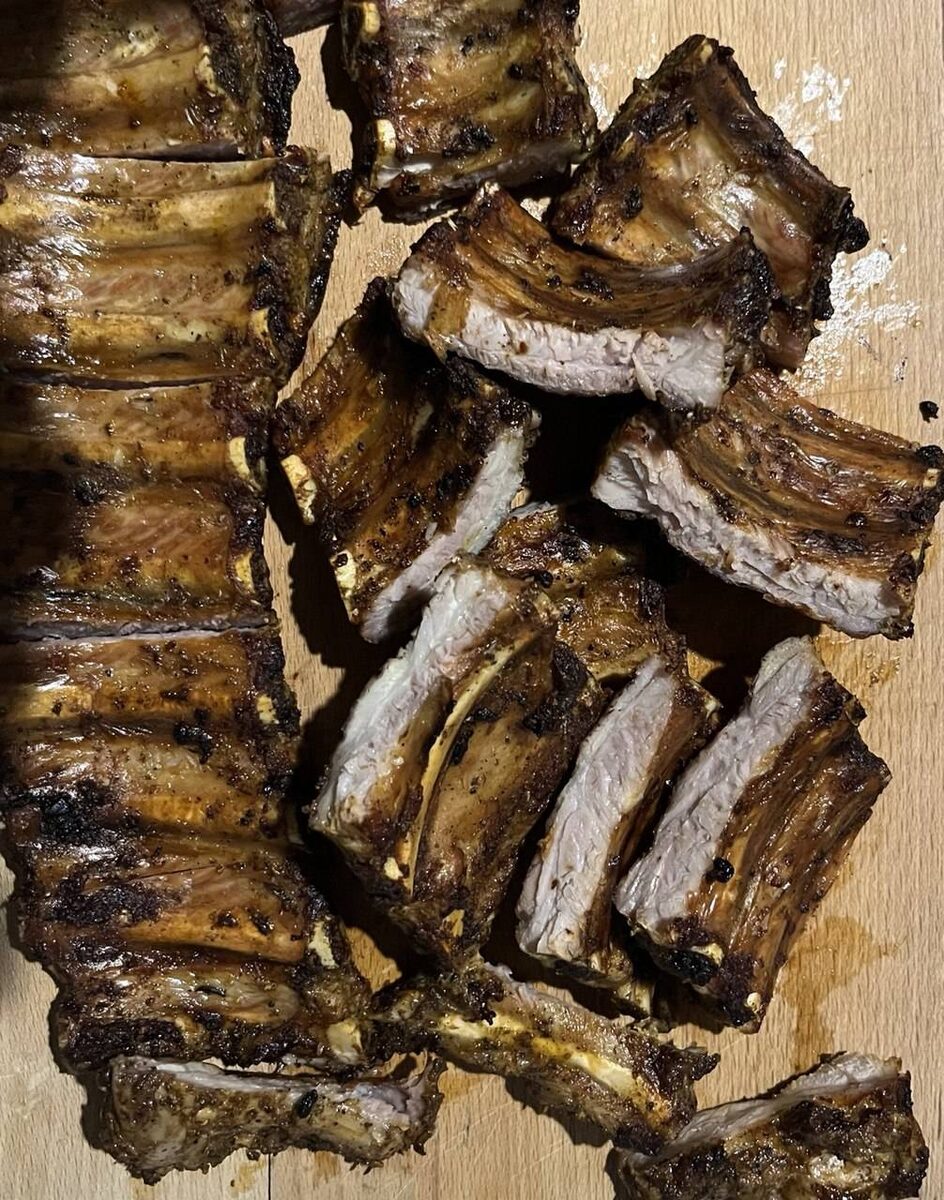 Ингредиенты: свинячих реберець, солі, гірчиці, перцю, Олія рослинна, соєвого соусу, кетчупу, сушених трав Способ приготовления: М'ясо помити та просушити. Зрізаємо зайву плівку та жир. Та не весь жир зрізаємо, на кісточках повинно бути м'ясо з невеликими жировими прошарками. Так страва буде соковитою. З кетчупу, гірчиці, соєвого соусу робимо маринад. Додаємо сіль та перець, трави. Ребра натираємо маринадом, лишаємо маринуватись на 1-1,5 години. Розігріти духовку до 180 градусів. Дно дека змастити олією, викласти ребра. Запікати приблизно годину. Можна ребра покласти в рукав для запікання.