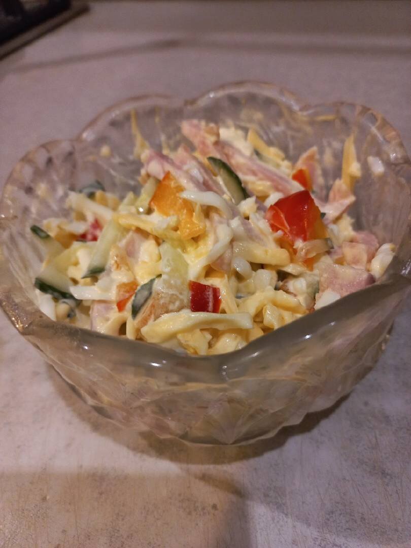 Рецепт этого салата я подсмотрела в любимом кафе ))) Он очень вкусный и не сложный в приготовление🤫 Все продукты я брала на глаз. Ингредиенты: Ветчина, Яйцо куриное, Огурец свежий, Перец болгарский, Твёрдый сыр, Майонез, Соль, чеснок Способ приготовления: Подготовим необходимые продукты. Ветчину режем соломкой и укладываем первым слоем, смазываем майонезом, добавляем немного чеснока. Следующий слоем идут яйца, тертые на крупной терке, смазываем слой майонезом, выдавливаем немного чеснок. Огурец режем соломкой и укладываем следующим слоем. Промазываем майонезом с чесноком, и добавляем нарезанный кубиками или соломкой болгарский перец, заново добавляем немного майонеза с чесноком и сверху кладём тёртый на крупной терке сыр. Готовый салат можно убрать в холодильник на пару часов или ночь, кто как хочет. У меня он не выстаивается и пары минут, сразу слетают со стола.😊