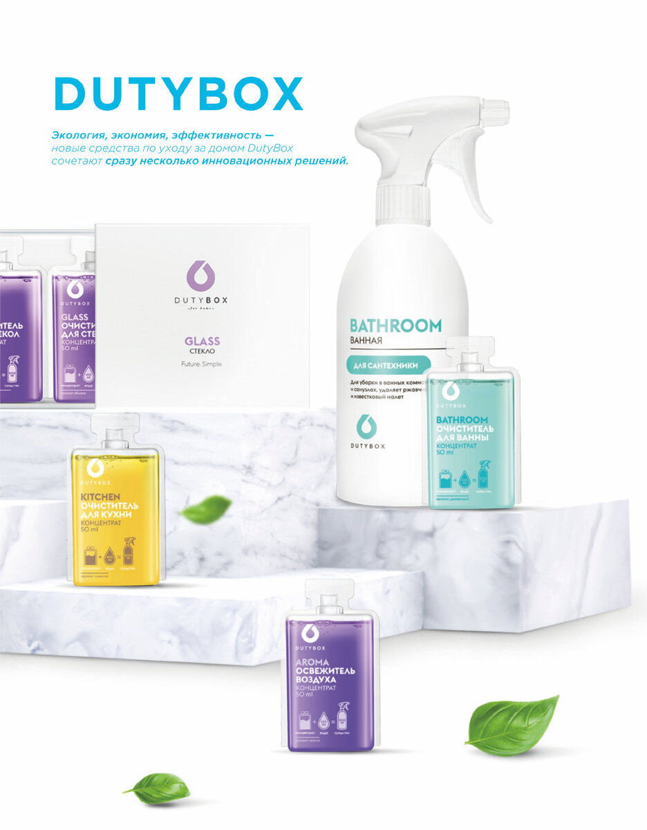 DutyBox вышел на российский рынок в 2018 году, а с этой осени марка представлена и в сети «Мир Упаковки». Это линейка «экологически дружелюбной» бытовой химии. Словосочетание не из привычных, давайте разбираться. Идея DutyBox проста. Каждый раз, приобретая бытовую химию (хоть средство для мытья посуды, хоть спрей для стёкол) мы покупаем не только бытовую химию. Ясно, что в стоимость включена и упаковка, и логистика — но главное тут другое. Активных веществ в бутылочке обычно лишь ~10%, остальную часть составляет вода. И, подумали в DutyBox, почему бы не убрать её из уравнения? Тогда понадобится упаковка в 10 раз меньше по объёму, которую во столько же раз дешевле транспортировать и проще хранить. Математика эта хорошо знакома пользователям профессиональной химии. Например, в области средств для клининга давно и широко применяются концентрированные средства, которые пользователь самостоятельно разбавляет водой и разливает в многоразовые ёмкости. Но DutyBox стали первой FMCG-маркой Росси