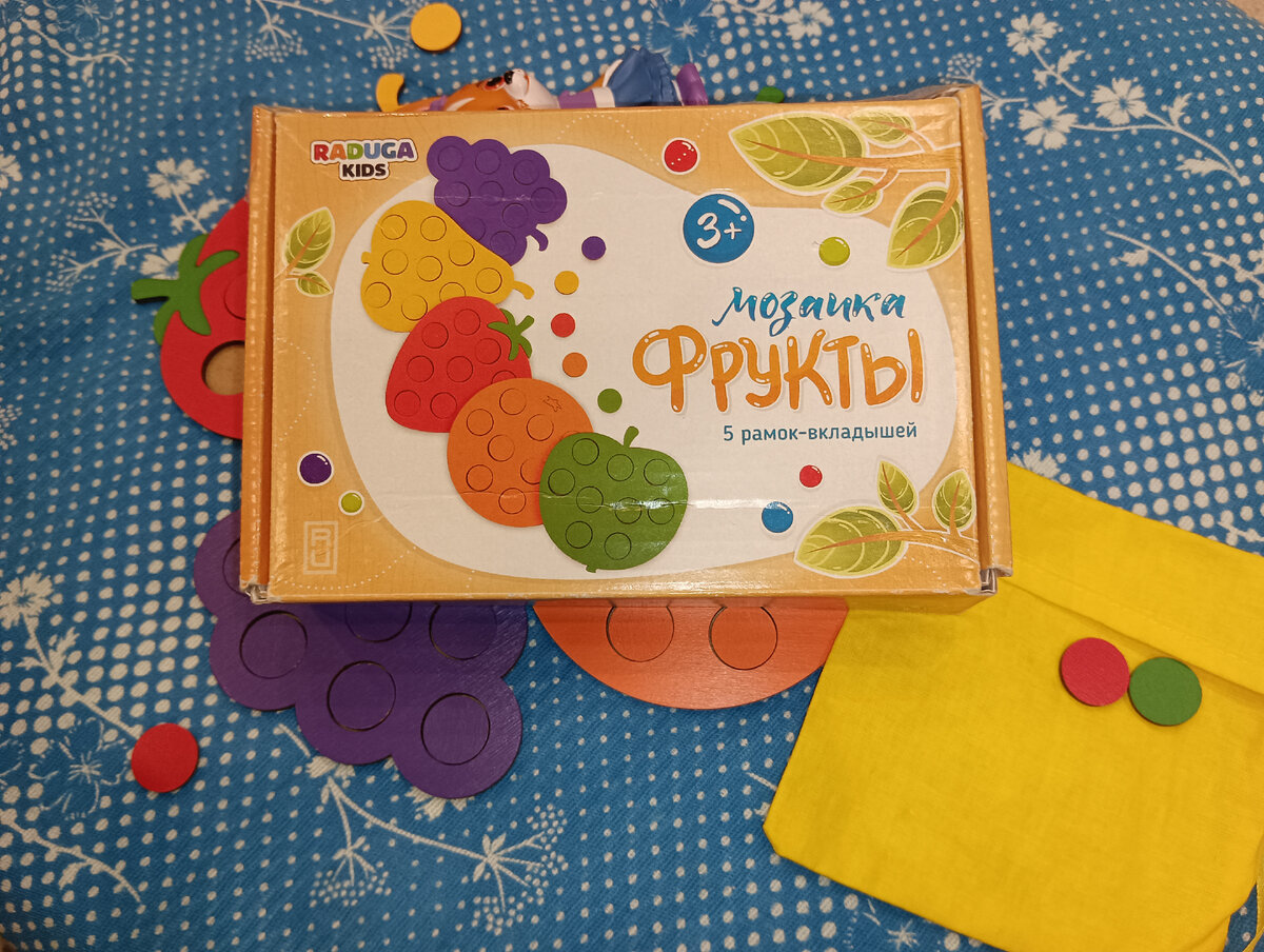 Здравствуйте! Сегодня хочу вашему вниманию представить Сортёр Мозайка-фрукты от фирмы Raduga Kids. Этим набором мы пользуемся с удовольствием. Так вышло, что линейка этой фирмы занимает место на полке. Этот Сортёр способствует развитию ребёнка, позволяет изучать цвета в игровой форме. Она состоит из пяти деревянных фигур в виде фруктов, в них имеются пустые круглые окошки, куда нужно вкладывать круглые фигурки. Впечатления и реакция ребёнка: Такие яркие фрукты сразу привлекли внимание. Дочка, заметив коробку, с удовольствием открыла её. В ней предоставлены фигурки фруктов - груша, яблоко, апельсин, виноград, клубника. В жёлтом тканевом пакетике находились круглые фигурки соответствующих цветов, чтобы их вкладывать в пустые окошки фруктов. На каждый цвет идёт по 10 штук. В фигурке девять отверстий, а значит десятая будет везде запасным вариантом в случае потери цветного кружочка. А так не всегда можно придерживаться одной линии игры, цвету, можно придумывать различные игры. Например, к