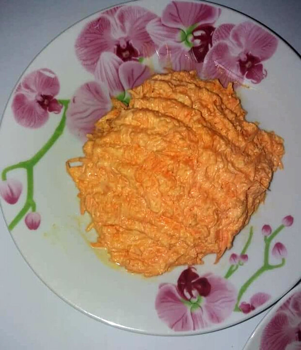 Морковь свежая (сколько душе угодно), майонез домашний, чеснок и соль.