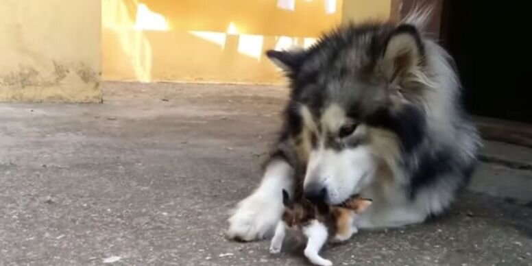 Маламут-старожил встречает крошечного котёнка: такого итога никто не ожидал