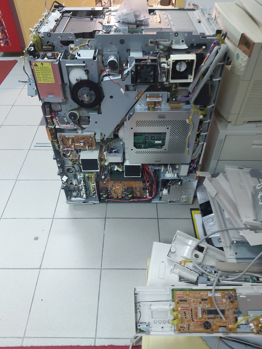 Иногда, даже очень иногда, приходится подбирать то, что валяется прямо под ногами. Вот и в этот раз прихожу с обеда на работу, а тут наши ремонтники разбирают принтер. Причем совсем разбирают, на мусорку. А разбирают чтобы выбрасывать было легче. Принтер этот формата А3, и он представляет собой целый шкаф размером примерно метр на метр и в высоту полтора метра. По массе не скажу, но очень тяжелая штука. И вот чтобы его было легче тащить они решили его разобрать по частям. Для оценки масштаба покажу этот принтер без крышек и стенок Мой взгляд упал на шаговые двигатели, которые установлены в лотках для подачи бумаги. На мой вопрос не нужны ли разборщикам эти двигатели они лишь усмехнулись и сказали, что нет. Ну я их и забрал себе. Есть у меня давняя мечта сделать станок ЧПУ. Вот все никак не сделаю. Двигатели теперь у меня уже есть, осталось дело за малым. Шаг 1,8 градуса. Если посчитать, то это получается целых 200 шагов на один оборот. Питание, всего 2,2 вольта при токе 2 ампера. В ин