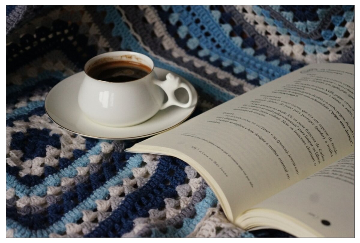 Впервые кофейные чашки такой формы я увидела в 1991 году в Греции. Мне они очень понравились. Я тогда даже привезла из Афин целый кофейный сервиз. А лет шесть назад в музее-заповеднике Царицыно увидела вот эту чашку. Точнее не конкретно эту, а такую же, только с рисунком. Вернее чашек было несколько, с разными рисунками. Покупать в музее не стала. Позже, просматривая каталог изделий ИФЗ в интернете, наткнулась вот на эту и ... купила. Кофе. Книга. Тёплый плед.
