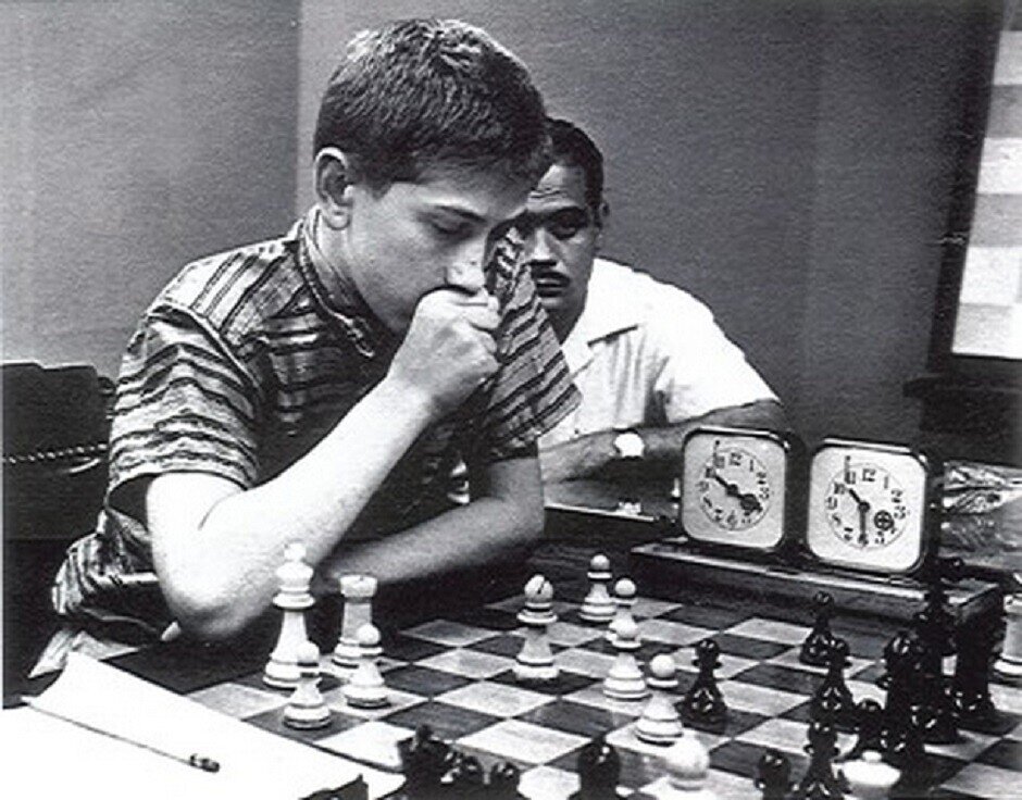 - Эта позиция из партии Фишер - Шервин, 1957, что случилась на чемпионате США по шахматам. Бобби тогда было лет 14-15, и он тогда уже зарекомендовал себя талантливым малым.