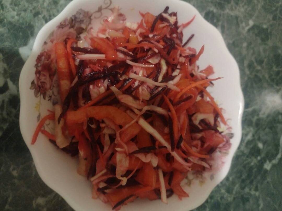 Это витаминный салат, как говорят, на скорую руку. Все овощи используются в сыром виде, т.е. сохраняются все витамины. Очень полезный и для тех, кто хочет похудеть. Ингредиенты: свеклы, морковь, свежий огурец (можно и без него), сладкий перец, квашеная капуста , чеснока, уксуса, растительного масла, соль, молотый перец, зелёный лук по желанию Способ приготовления: Все овощи (в свежем виде) нарезать соломкой или натереть на тёрке для корейской морковки. Добавить квашеную капусту, её количество определить самостоятельно (в зависимости от кислоты и вкуса). Смешать овощи в миске. Чеснок пропустить через пресс, добавить к овощам, посолить, поперчить, добавить уксус и хорошо перемешать. Растительное масло нагреть на сковороде и залить салат. По желанию можно добавить в конце измельчённый зелёный лук. Перемешать. Салат готов. Приятного аппетита!