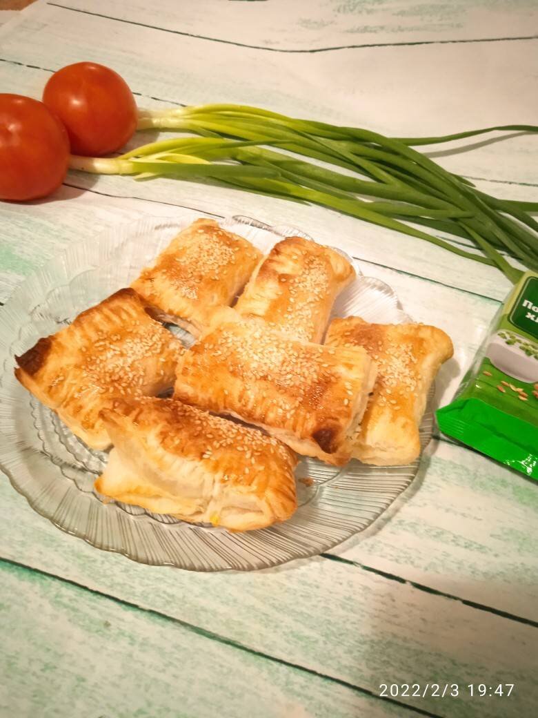 #фотошкола1 Всегда выручает слоёное тесто. Просто, быстро, вкусно. Так же вкусно как в холодном, так и в горячем виде. Ингредиенты: слоёного теста, зелёного лука, сыра, яйца отварных, яйцо сырое Способ приготовления: Разморозить тесто. Отварные яйца и сыр натереть на крупной тёрке. Лук нарезать не сильно крупно. Размороженное тесто разрезать на квадраты. Выложить начинку на край, закрыть вторым краем, вилкой придавить края. Сырое яйцо разбить, взбить смазать изделия. Выпекать в разогретой до 200-220 градусов духовке. 10-15 мин. Смотрите по своей духовке. Приятного аппетита! Буду рада фотоотзыву.