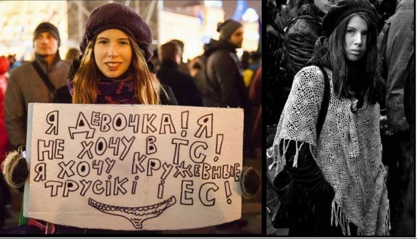 Всем памятны эти фото с Евромайдана начала 2014 года. Юная улыбчивая киевлянка гордо стоит с плакатом, на котором слегка украинизированным (добавили букву i) русским языком, написано следующее: Лозунг, отметим, был основан на популярном майданном мифе о грядущем запрете тогдашним президентом Украины Виктором Януковичем на экспорт нижнего белья из Европы. Якобы Янукович готовился запретить нижнее белье из полиэстера - искусственной ткани, сделанной на основе нефти. Из которой в ЕС и плетут указанные кружева. Сам неказистый плакат был нарисован украинским художником Олексой Манной. И с его творением тогда сфотографировалось около десяти девушек. Но прославилась на весь Майдан вот только одна... Фото с нею мгновенно разошлось на мемы. По поводу и без. Например, в связи с событиями в Екатеринбурге. Кто же эта девушка? Барышню с плакатом быстро деанонимизировали. Как позже выяснилось, звали протестовавшую против Таможенного Союза красотку Ольга Значкова. На Майдане ее знали под прозвищем Зн