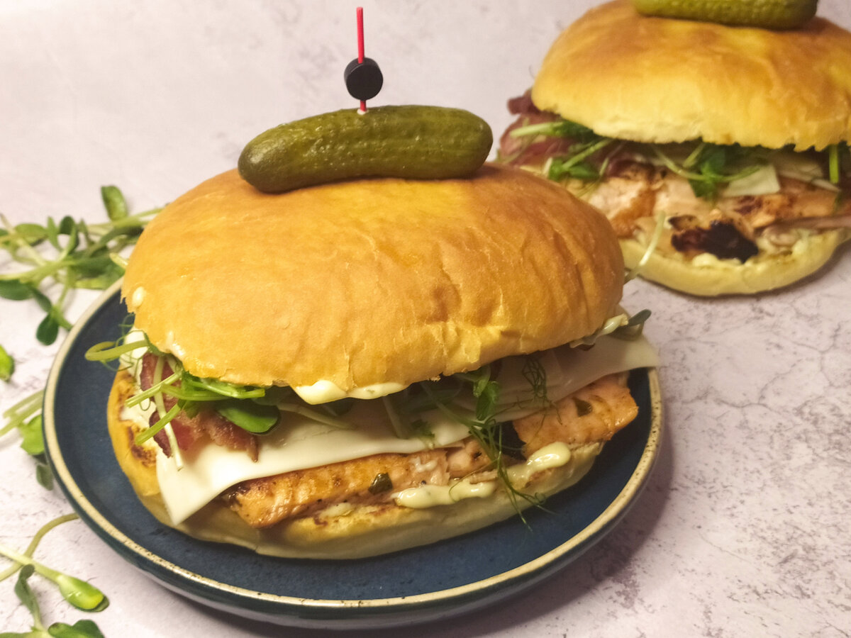 Лосось на гриле и в общем-то этим многое сказано. Но сделаем его интересней и вкуснее - добавим маринад. Маринад приготовим с добавлением мяты, базилика и меда и поливать лосося будем во время жарки. Ну и конечно для такой рыбы нужен интересный соус - в этот раз сделаем не классический тар-тар, а майонезный, но для более яркого вкуса используем базилик. Лучше всего приготовить японский кьюпи - это поднимет вкус на совершенный уровень, но можно использовать и обычный майонез. Еще будет хрустящий жаренный бекон. Что касается сыра - выберем моцареллу. И для свежести добавим микрозелень, лучше использовать люцерну, но также подойдет подсолнечник или горох. 3 булочки для сэндвичей