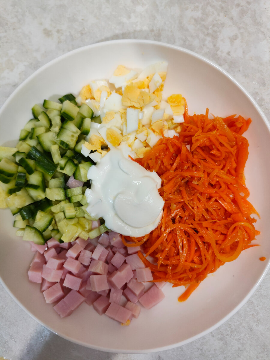 В конце галереи с фотографиями процесса приготовления приложу скрин анализатора блюда с КБЖУ Отварить яйцо, почистить. Кубиком, или как удобно, нарезать свежий огурец, ветчину маложирную (у меня из индейки 3% жира), можно заменить на отварную грудку. Добавить морковь по-корейски. Заправить сметаной или йогуртом. Перемешать Посыпать зеленью. Я использовала вот такую морковь, возможно, Вы найдете лучше, либо сделаете сами. Вот что получилось по КБЖУ. Приятного аппетита 🤗 Напишите обязательно в комментариях, будете готовить?! Короткое видео тут https://zen.yandex.ru/video/watch/6200f0aa8e1e9f0115974b44
