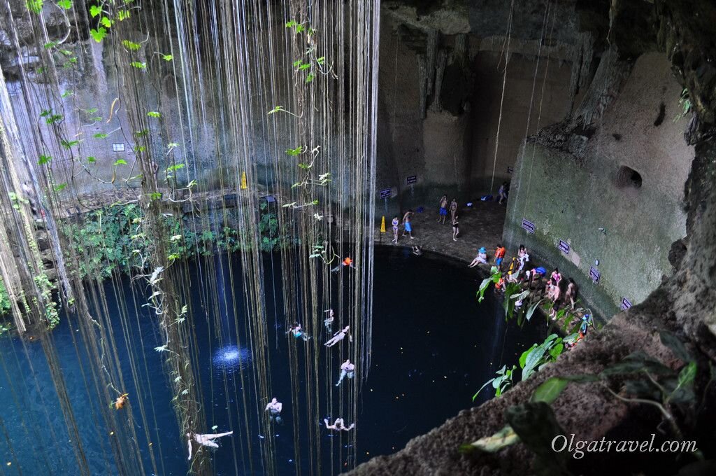 А теперь поговорим про сеноты в Мексике. На полуострове Юкатан в земле много известковых пород. Которые обрушаются вследствие природных причин. Подземные воды размывают известняк, он рушится и образуются пещеры различных размеров. Для индейцев майя сеноты были священны – для них они, как врата в подземный мир, где живут различные боги из царства мертвых. Одними сенотами пользовались, чтоб там отдохнуть. В других молились. А в третьи скидывали жертв в ритуальных целях или даже были такие, куда бросали преступников. Совершил преступление – лети к чертям. Причем считалось, что если ты выбрался из сенота, что практически невозможно, так как это больше похоже на природный колодец, то ты оправдан. Говорят, что из одного такого колодца паре человек удалось выкарабкаться. Но это как миф или легенда, на самом деле это, практически, невозможно. Сеноты обычно заполнены водой, в них прохладно, летают разные птички, на стенах приспособились всевозможные растений. Из-за того, что в сенотах была вода