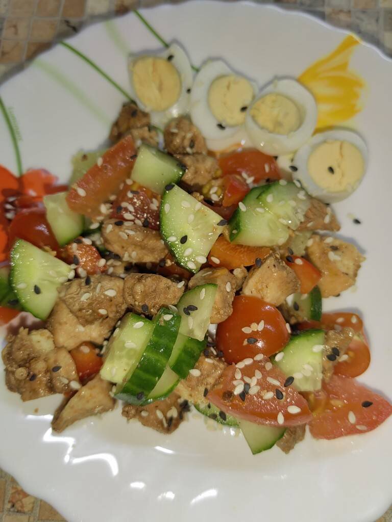 Ингредиенты: Филе курицы, Огурец, Помидор черри, Перец болгарский, Заправка на ваш вкус, у меня Майонез, Кунжут, Яйцо перепелиное Способ приготовления: Все овощи нарезать кубиками крупными. Курочку на мелкие кусочки обжарить в любимый специях, в конце добавить соевый соус.