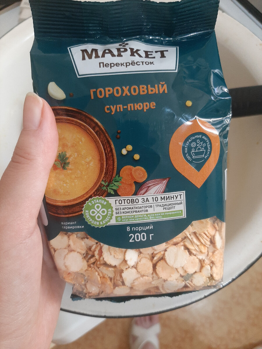 Всем привет! Добро пожаловать на мой канал! Давно у меня не было обзоров на продукты, которые можно приобрести в наших магазинах. Ссылки на другие обзоры оставлю в конце статьи, вдруг вас что-то заинтересует, а сегодня расскажу вам о смеси для горохового супа-пюре из "Перекрестка". Я бывает покупаю такие смеси и использую, когда нет времени готовить, а хочется супа. На мой взгляд, очень удобно: засыпал, подождал, вауля и никаких тебе пережарок, резки и прочего. Так вот, такой 200 граммовый пакетик обошёлся мне в 109.90 рублей. Получиться должно 8 порций супа, примерно 2 литра (чуть поменьше). Внутри пакета гороховые хлопья, сушеная морковь, лук, зелень. В принципе, нормально. Соли нет, под конец варки суп надо посолить и поперчить по вкусу. Засыпать смесь нужно в 1,6 литра кипящей воды или бульона. У меня овощной бульон, как готовлю, смотрите в ролике. Варим по инструкции 10 минут под закрытой крышкой. Что могу сказать в итоге. За 10 минут смесь действительно сварилась и даже увеличи