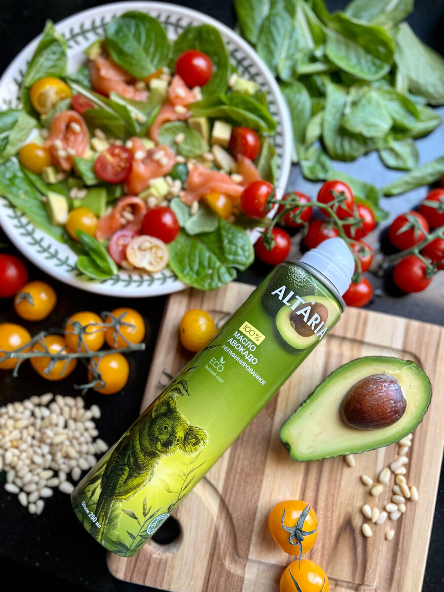 🧑🏻🍳 #рецепт невероятно вкусного и лёгкого в приготовлении салата с изюминкой, а точнее с авокадинкой 🥑 🥬Листья салата , кто какие любит, я взяла мини-романо 🍅 Помидоры черри, я использую красные и желтые для яркости блюда 🥑 Авокадо 🐟 Красная рыба слабой соли 🌰Кедровые орешки 👌🏻И изюминка - масло авокадо в спрее от Altaria Масло #Altaria я использую много лет, и каждый раз, когда кто-то видит его у меня на кухне, обязательно задаёт вопрос, а потом восхищается и проникается к продукту, и попробовав, становится его постоянным потребителем! Что же в нем такого? 👉🏻Дозатор-аэрозоль распыляет масло порционно, с расчётом 4 ккал на одно нажатие и имеет 3 режима распыления (спрей-струя-капли). Это также позволяет экономично использовать продукт, в среднем баллона 250 мл хватает на 2-2,5 месяца. 👉🏻Упаковка позволяет на всём протяжении хранения и использования оставаться маслу свежим и полезным, не допуская контакт с кислородом и солнечными лучами, что исключает процесс окисл