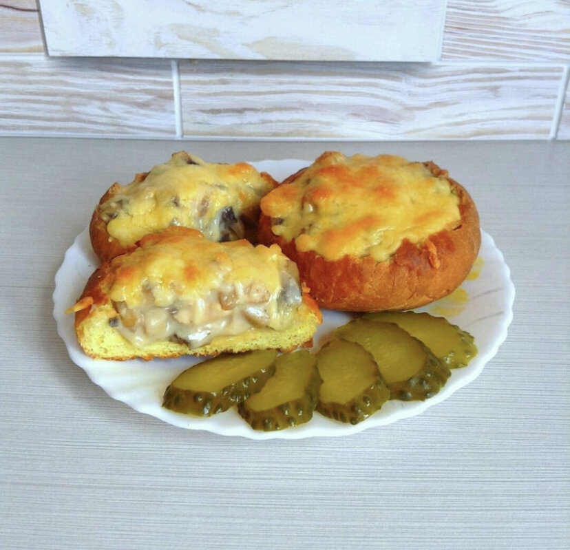 Грибной жульен в булке булочки – 4-5 шт. грибы (шампиньоны) – 200 г курица (филе) – 150 г сливки (20%) – 180 мл твёрдый сыр – 80 г лук – 1 шт мука – 1 ст.л. сливочное масло – 30 гр, соль, перец – по вкусу Грибы обжариваем с луком на масле, добавляем кусочки куриной грудки, тушим примерно 10 мин. За это время у булочек срезаем верхушки и выбираем мякишь. Аккуратно, чтобы не повредить стенки булки. Грибы с мясом посыпаем мукой, заливаем сливками, солим, перчим. Даем чуть покипеть, чтобы загустела подливка. Затем заливаем нашим жульеном булочки и посыпаем тертым сыром. Запекаем в духовке до зарумянивания сыра. Вкуснятина готова!!!