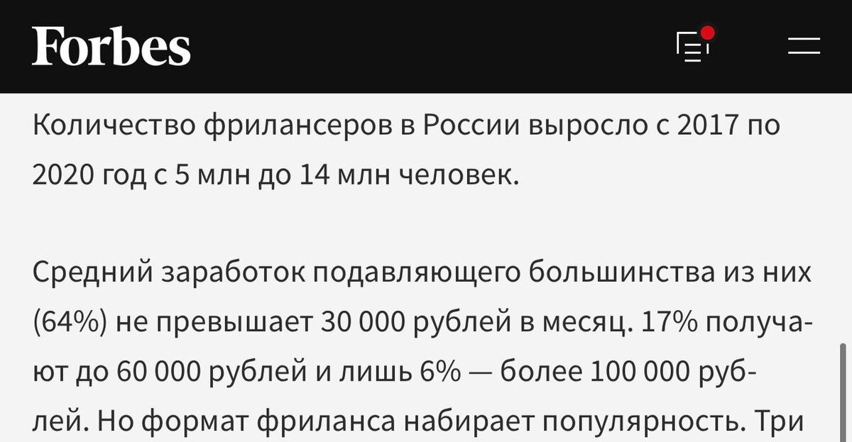 Продолжим копаться в Грязном белье маркетологов 😅 Мы уже определили, что выделяется 3 вида рабочих маркетологов Первый пункт мы разобрали в первой части А теперь продолжим… 2 пункт - Фрилансеры. Самые замечательные люди 😁 Фрилансером можно быть работая на одну компанию и работать удалённо или самостоятельно искать заказы. Немного статистики: по данным Forbes средний заработок фрилансера составляет до 30 000 рублей. Как бы грустно это ни звучало. Чаще всего, это выходцы курсов, которых не научили системному поиску клиентов, личному росту и продажам свыше 15000 рублей. А вот те, кто удалённо работают на компании могу зарабатывать от 100 000 рублей, но нужен хороший бэкграунд и опыт работы от года (хотя бы), но чаще от 3-х лет. Что насчёт «работай откуда угодно». Честно, я не знаю ни одного фрилансера, который работает в Париже или сидя на пляже Бали. Соедний чек такого работника 15000 рублей (почему так происходит, расскажу в следующих статьях). Чтобы работать в разных точках пла