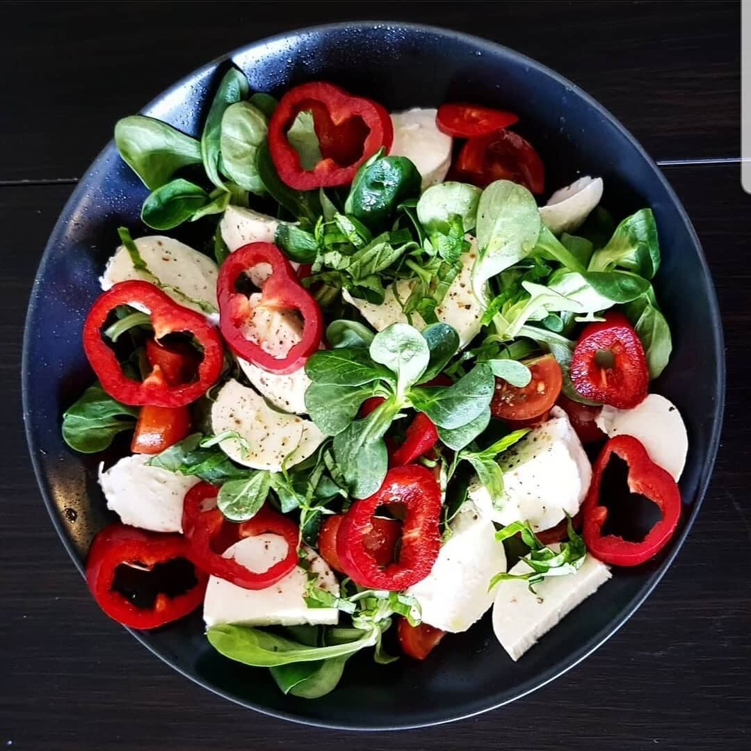 🥗Для салата Вам нужен фельд салат, томаты, сыр моцарелла, остроконечная паприка. 🍶Для соуса: Уксус бальзамический светлый, горчица, оливковое масло, лук (если есть красный) соль, сахар, перец, прованские травы. 🔪Все овощи и сыр для салата нарезать и замешать в миске, в большой миске☝️ (иначе будет вываливаться) 🔪Для соуса порубите половину небольшой луковицы как можно мельче, прям мелко мелко. в 1 ст.ложке уксуса растворите пол чайной ложки сахара, щепотку соли и пол чайной ложки горчицы, а затем влейте тонкой струйкой 3 ст. ложки оливкового масла постоянно помешивая. Добавьте лук и перемешайте. 🥗Добавьте Ваш соус в миску с салатом и аккуратно 👐(можно руками) все перемешайте. 😋Посыпать щепоткой прованских трав для аромата и минут через 5 можно подавать.