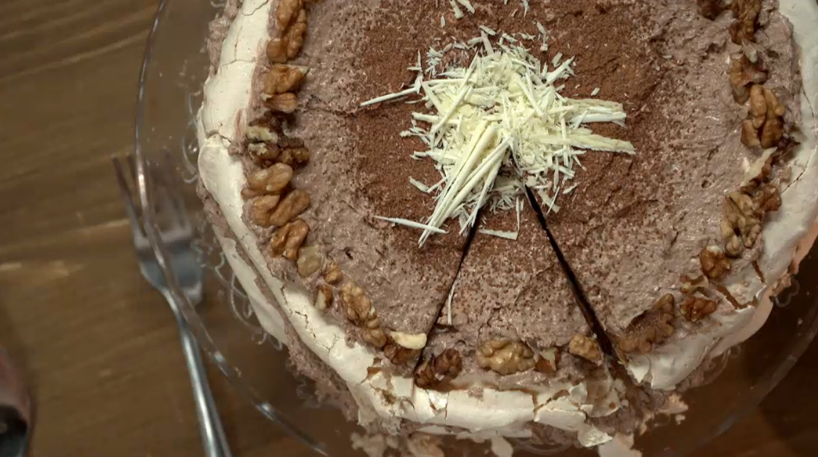 шоколад белый Способ приготовления 1. Для коржей отделяем белки от желтков. В деже взбиваем белки, когда они побелеют постепенно всыпаем весь сахар и взбиваем до состояния меренги. 2. Смазываем форму для выпекания водой, покрываем пергаментом, на пергаменте «рисуем» контур для коржа. Раскладываем меренгу на 3 противня и ставим в духовку, сначала на 3 минуты при 230 градусах, а затем снижаем температуру до 120 градусов и выпекаем 1 час. После выпекания даем коржам остыть. 3. Для крема взбиваем миксером сливочное масло, затем добавляем 150 г сахара и продолжаем взбивать, вводим сгущенное шоколадное молоко и всё тщательно вымешиваем. 4. В блендере измельчаем грецкие орехи, часть орехов оставляем для декора. Объединяем крем с орехами. 5. Подача. На плоскую подставку наносим небольшое количество крема, чтобы коржи зафиксировались и не скользили, далее выкладываем первый корж. Наносим первый слой крема, это можно сделать с помощью лопатки, но легче распределить крем с помощью кондитерского м