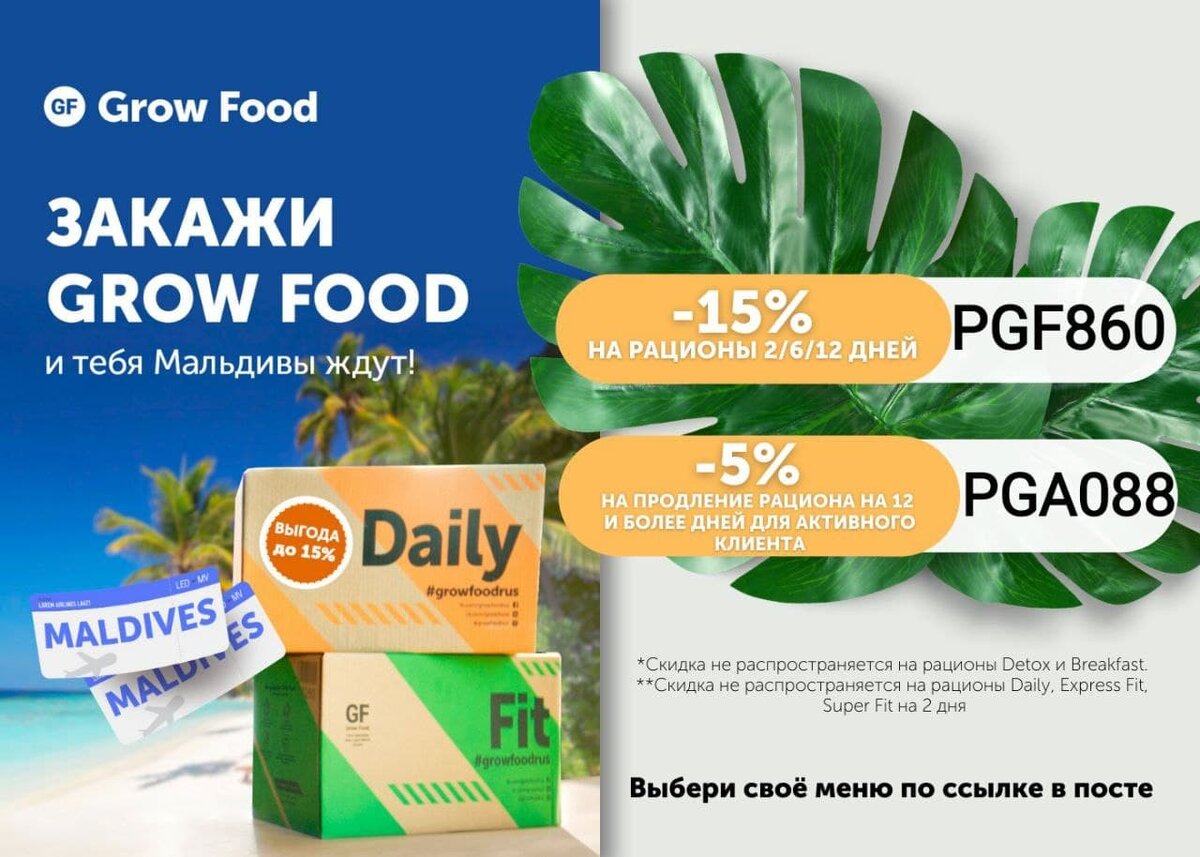 С 24.01 по 27.02 закажи Grow Food и выиграй одну из 10 поездок на Мальдивы на двоих! Скретч-карты с призами можно найти в каждой третьей коробке. Сотри защитный слой и выиграй бонусы на счет в Grow Food или поездку мечты! 📌 Скидка 15% на рационы Grow Food на 2, 6 и 12 дней по промокоду PGF860 для нового и вернувшегося клиента. 📌 Скидка 5% на рационы от 12 дней для активного клиента. ❗️ Скидка не распространяется на рационы Detox и Вreakfast, Daily, Express Fit, Super Fit на 2 дня Заказывайте по ссылке https://bit.ly/3rucYu3