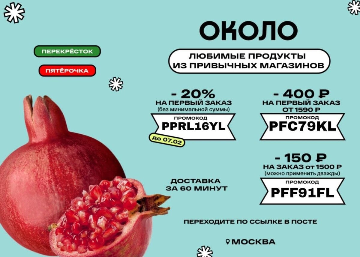 Промокод: PFF91FL скидка 150₽ от 1500₽ для всех пользователей (можно применить дважды). Промокод: PFC79KL скидка 400₽ на первый заказ от 1590₽ только для Москвы и МО Промокод: PPRL16YL скидка 20% на первый заказ без минимальной суммы. ‼️Зону доставки проверяйте в приложении по ссылке‼️https://bit.ly/3uqL7wq
