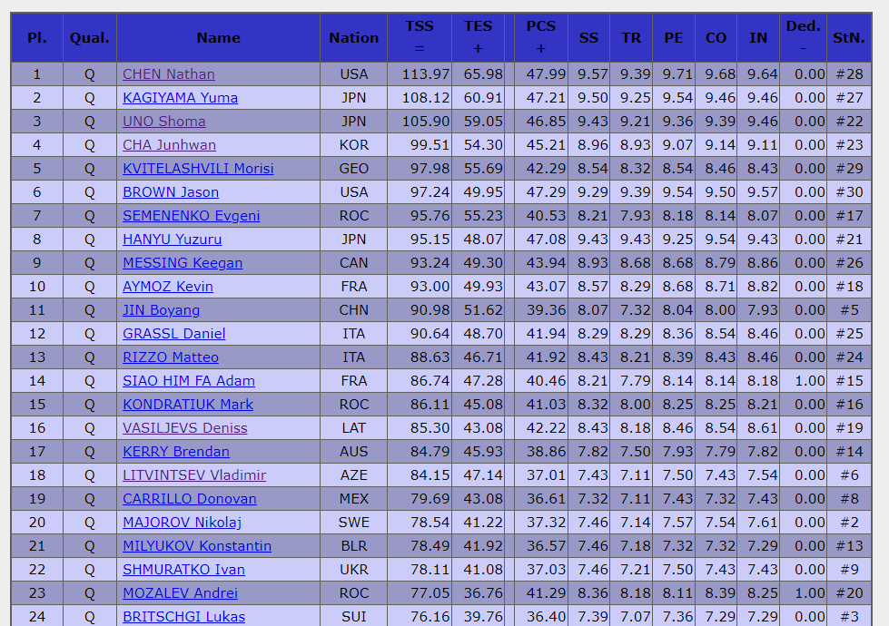 Браун уверенно справился со своим довольно простым прыжковым контентом - 3Ф, 3А, каскад 3Л+3Т и за счёт высокой второй оценки обеспечил себе место в сильнейшей разминке, подвинув нашего Семененко на 7 место.