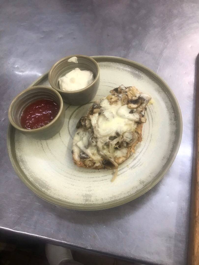 Ингредиенты: грудинка, сыр любой, лук, грибы шампиньон Способ приготовления: Для начала возьмите грудинку и об жарите её с двух сторон. Возьмите грибы и лук обжарите в сковородке минут 5 до почти готовности. Возьмите плоскую тарелку и положитете на неё грудинку, сверху на грудинку положить лук с шампиньонами, поверх грибов и грудинки натереть сыр на мелкой терке. Отправить в микроволновку на 3 минуты, подавайте с аджикой и соусом тар-тар.... Всем приятного аппетита! ☺️🙏