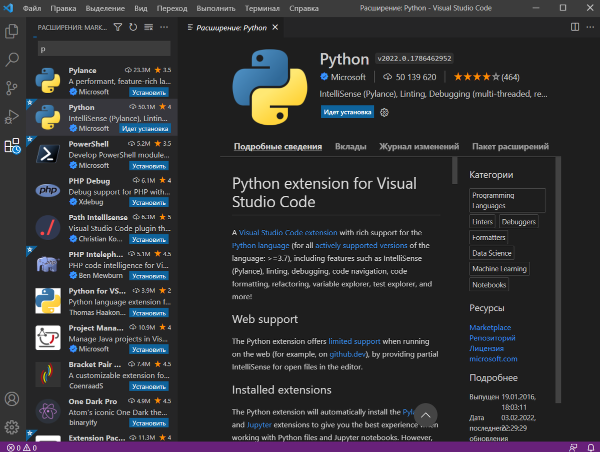 Максимально кратко как поставить: Скачиваем https://code.visualstudio.com/ После установке запускаем, и прога сама предложит поставить русский язык. После заходим в расширение, можно комбинацией клавиш CTRL+SHIFT+X или кликнуть по иконке слева. Ищем в строке Python, нажимаем установить. p.s.: решил перейти на visual studio так как он показался мне более удобный. Всем спасибо за внимание, надеюсь я помог вам тоже с установкой.
