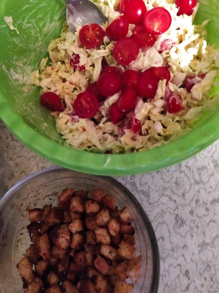 Ингредиенты: Пекинская капуста, Помидоры черри, Яйцо вареное, Сыр, Хлеб, Масло растительное, Соль, перец , Сметана/Майонез, Чеснок Способ приготовления: Все овощи вымыть. Яйца отварить вкрутую. Для начала приготовим сухари, чтобы они успели остыть, пока готовим салат. Нарезаем хлеб кубиками. Добавляем растительное масло, специи, соль и перец по вкусу. Все хорошо перемешать и оставить пропитаться минут на 5. Жарим на сковороде до готовности на небольшом огне. Как сухари будут готовы, оставить их остывать. Для салата нарезаем пекинскую капусту, яйца, помидоры черри. Делаем заправку: я смешивала сметану с майонезом, выдавила чеснок и соль, перец по вкусу. Заправляем наш салат. Сверху натираем сыр, перемешиваем и снова натираем, чтобы сыр был как внутри салата, так и сверху. Сухари можно засыпать сразу в салат, а можно добавлять порционно.