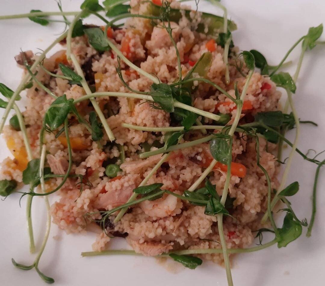 #календар #ігри Ингредиенты: замороженої овочевої суміші, філе птиці, креветок, кус-кусу, Спеції , рослинної олії Способ приготовления: Овочі тушимо з олією 10 хвилин. Додаємо порізане кубиком філе. Додаємо креветки. Тушимо до готовності. Додаємо спеції. Кус-кус заливаємо окропом і накриваємо. Залишаємо на 10 хвилин. Додаємо до суміші. Готуємо ще 5 хвилин.